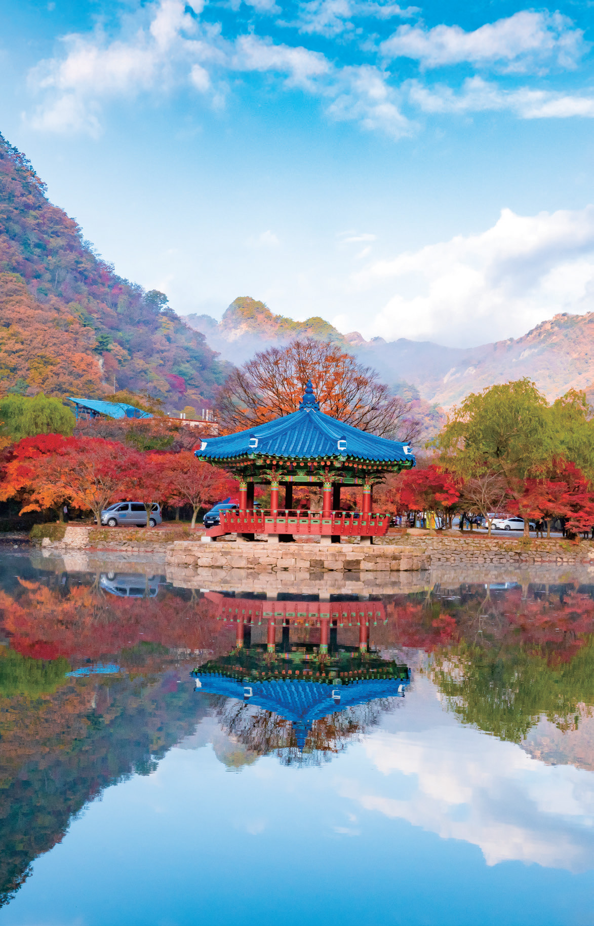 내장산으로 오르는 길목을 걷다 보면 연못 한가운데 떠 있는 ‘우화정’이 눈길을 사로잡는다. 잔잔한 수면 위로 정자와 단풍이 겹쳐 비치는 풍경은 한 폭의 수채화를 닮았다. 우화정(羽化亭)이라는 이름은 ‘정자에 날개가 돋아 하늘로 승천했다’는 전설에서 지어졌다.