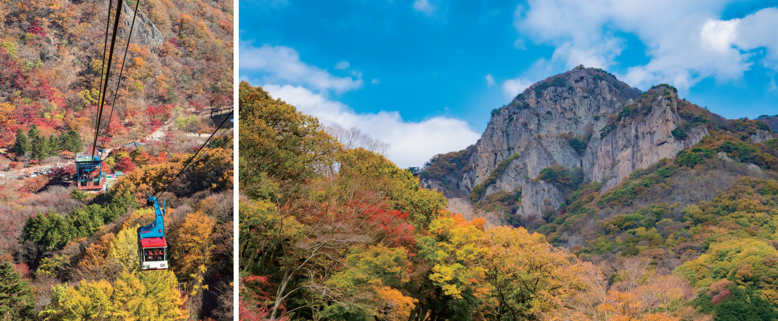 내장산은 직접 오르는 것도 좋지만 케이블카를 통해서도 즐길 수 있다. 발아래 병풍처럼 늘어진 능선과 단풍 물결이 한눈에 펼쳐져 왜 내장산이 ‘단풍 1번지’임을 실감하게 된다. 내장산 탐방안내소에서 출발하는 케이블카를 타고 상부 정류장에서 내려 약 300m만 더 걸으면 연자봉 전망대까지도 금방이다. 노을 질 무렵 전망대에서 바라보는 풍경은 가을 단풍과 붉게 물든 하늘이 어우러져 그 아름다움이 절정에 이른다. 케이블카는 계절과 기상 상황에 따라 운행 시간이 조금씩 달라지니 미리 알아보고 가는 것이 좋다. 트레킹을 겸한다면 왕복 1~1.5시간 내외로 가볍게 다녀올 만한 코스도 있다. 케이블카 탑승 전 안내센터에서 내장산 전체 모습을 미리 살펴보면 산세가 머릿속에 그려져 걷는 재미가 배가된다.