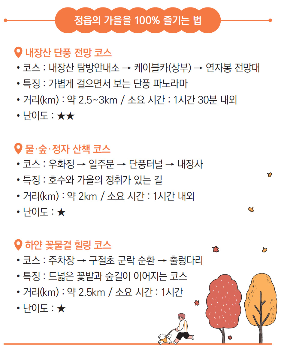 내장산국립공원의 단풍 능선과 물 위에 떠 있는 우화정, 하얀 꽃물결로 물드는 구절초 지방정원 그리고 유네스코 세계유산 무성서원까지.