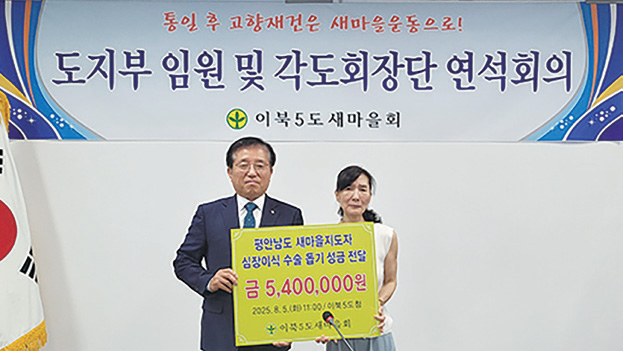 이북5도새마을회(회장 조성원)는 지난 8월 5일 서울 이북5도청에서 박춘길 평안남도협의회 새마을지도 자를 돕기 위한 성금을 전달했다. 이날 성금은 박춘길 지도자의 여동생 박춘희 평안남도 부녀지도자에게 전달됐다. 박춘길 지도자와 부인 이기순 평안남도새마을부녀회장은 부부 새마을지도자로 지역사회 발전 을 위해 헌신해 왔다. 그러나 지난 5월 박춘길 지도자가 심근경색으로 쓰러졌고, 현재 1억 원이 넘는 수 술비에 어려움을 겪고 있었다. 이에 조성원 회장은 도회장단과 총 600만 원의 성금을 모금해 전달했다