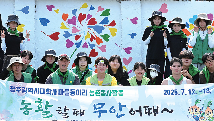 광주대학새마을동아리연합회(회장 조성인)는 지난 7월 12일부터 13일까지 2일간 무안군 무안읍 고절 리 마을에서 농촌봉사 활동과 재능기부 활동을 펼쳤다. 이번 봉사는 광주시새마을회 주관으로 진행됐으 며, 광주 소재 대학생 30명이 참여했다. 참가자들은 대학·지역·도시 간 공동체의 책임의식을 바탕으로 농촌을 지원하고 세대 간 소통의 장을 마련했다. 봉사단은 이틀 동안 고절리 마을에 머물며 폐비닐 수거, 한방 진료, 벽화 그리기, 찾아가는 마을극장, 반찬 나눔, 어르신 가사일 돕기 등 다양한 활동을 전개했다.