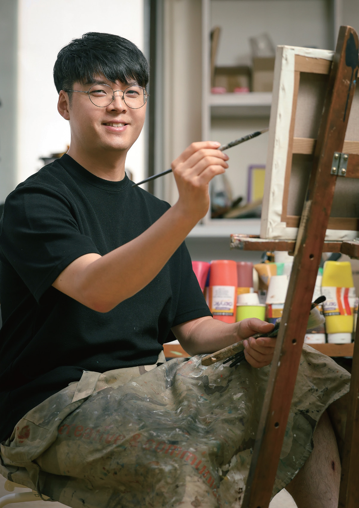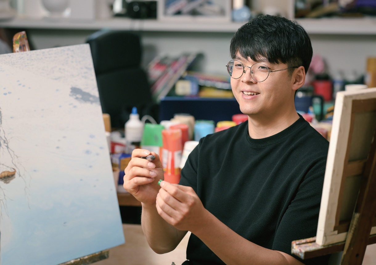 임지범 • 안녕하세요. 유화 작품과 라이브 드로잉, 벽화를 그리고 있는 임지범입니다. 저는 비 오는 날 바닥에 고인 빗물에 비친 빛의 풍경을 주로 표현하고 있는데요. ‘추상’과 ‘극사실’ 두 가지 시점이 동시에 담긴 것이 특징이죠. 최근에는 벽화와 라이브 드로잉으로도 활동 영역을 넓히며 새마을운동중앙회를 비롯해 공군, 국가보훈부, 경산시, 해양수산과학기술진흥원 등 다양한 기관과도 협업하고 있습니다.