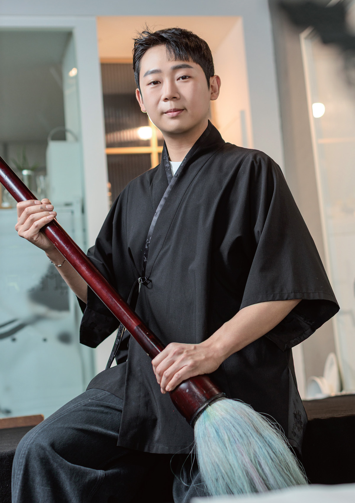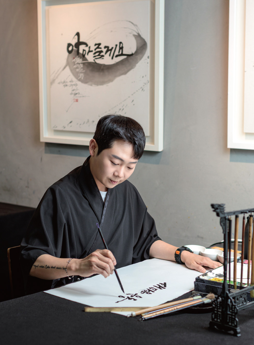 김무진 • 저는 처음 다큐멘터리 PD로 일을 시작했어요. 예고편을 제작하던 중, 어느 순간부터 제목과 자막에 쓰이는 글꼴(글씨체)이 눈에 들어오더라고요. 어떤 글씨체를 쓰느냐에 따라 영상의 전체적인 분위기와 전달력이 달라졌기 때문이죠. 그러다 제가 전하고 싶은 메시지를 직접 써보고 싶다는 마음이 생겼고, 캘리그래피와 현대 서예를 배우기 시작한 것이 지금까지 이어졌습니다. 캘리그래피 퍼포먼스는 관객과 호흡한다는 점에서 행위예술에 더 가깝습니다. 음악에 맞춰 글을 쓰고 다양한 의미를 담아내는 과정이 가장 큰 매력이죠.