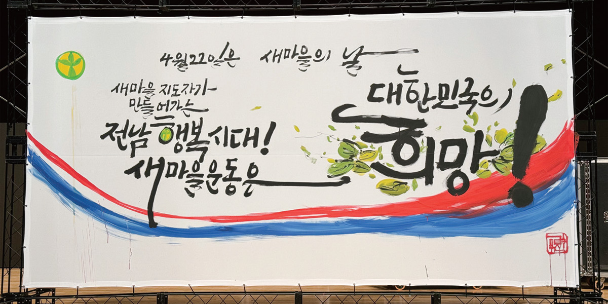김무진 • 저는 지난해 전라남도청에서 열린 전라남도새마을회 ‘새마을운동 54주년 기념식’ 무대에 직접 올라 ‘새마을지도자가 만들어가는 전남 행복시대! 새마을운동은 대한민국의 희망!’이라는 대형 문구를 쓰는 캘리그래피 퍼포먼스를 보여드렸어요. 이 문구가 가진 힘을 어떻게 해야 역동적으로 표현할지를 중점적으로 고민했죠. 새마을운동은 말 그대로 ‘대한민국의 희망’이잖아요. 그래서 이 문장을 강조하고자 가장 마지막에 큰 글씨로 쓰면서 퍼포먼스를 선보였죠.