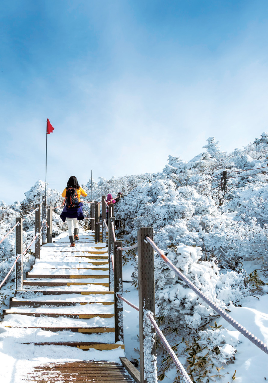 11월과 12월의 한라산은 두 개의 계절이 공존하는 신비로운 공간이다. 해발 고도가 낮은 곳에서는 아직 떠나지 못한 늦가을의 단풍이 붉게 타오르고, 고지대로 올라갈수록 겨울의 냉기가 나뭇가지를 하얗게 얼린다.