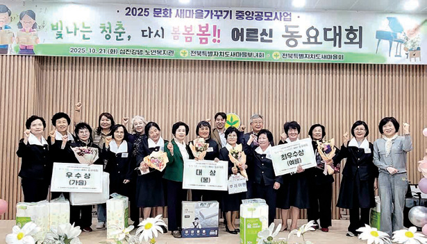 전라북도부녀회(회장 강귀자)는 지난 10월 21일 정읍시 섬진강댐노인복지관에서 ‘빛나는 청춘, 다시 봄봄봄’ 어르신 동요대회를 열어 세대 간 소통과 공감의 시간을 마련했다. 강귀자 회장은 “음악을 통 해 어르신들이 삶의 활력을 되찾길 바란다”고 밝혔다. 한편 전북도 대학새마을동아리연합회(회장 박 민준)는 지난 9월 27~28일 전북자연환경연수원에서 ‘2025 대학새마을동아리연합 워크숍’을 개최했 다. 이날 6개 대학 120여 명이 참여해 새줍깅, 안전·리사이클링 교육, 교류 프로그램 등을 진행했다