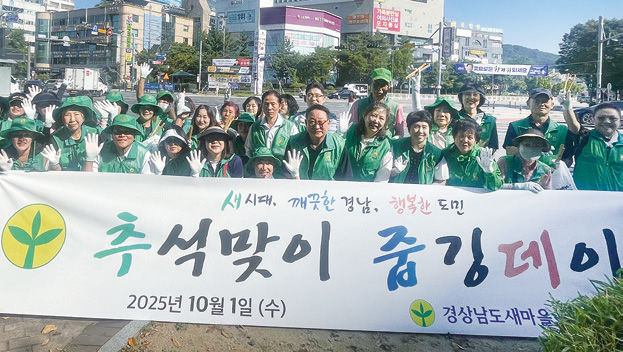 경상남도새마을회(회장 윤원섭)는 지난 10월 1일 창원시 명곡광장 일대에서 추석 명절과 APEC 정 상회의를 앞두고 ‘대한민국 새 단장 주간’에 동참해 환경 캠페인과 줍깅 활동을 전개했다. 이번 캠페 인은 귀성객과 시민에게 쾌적한 도시 환경을 제공하고, 주민이 함께 참여해 공동체 의식을 높이며 소 통과 협력의 문화를 확산하기 위해 마련됐다. 한편 ‘대한민국 새단장 캠페인’은 도내 18개 시·군과 읍· 면·동 전역에서 활발히 진행되고 있다.