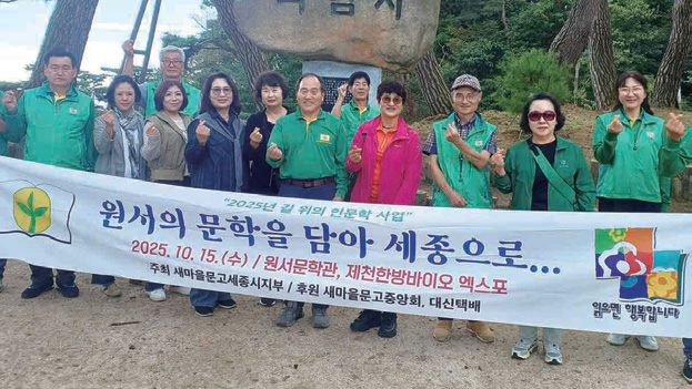 문고 세종시지부(회장 조철환)는 지난 10월 15일 제천을 방문해 ‘100세 시대 건강한 삶을 위한 한방 바이오엑스포’를 관람하고, 시인 오탁번 교수가 설립한 원서문학관을 찾아 문학 교류의 시간을 가졌 다. 참가자들은 천등산과 의림지 일원을 탐방하며 지역 문화와 선인들의 물 관리 지혜를 배우고, 문고 제천시지부의 피서지문고 운영 사례를 벤치마킹했다. 이를 통해 고복저수지 피서지문고 운영 활성화 와 2025년 ‘길 위의 인문학’ 사업 추진의 기반을 마련했다.