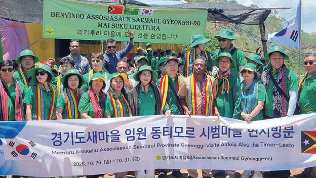 경기도새마을회(회장 이호경)는 지난 10월 26일부터 31일까지 4박 5일간 동티모르 시범마을에 방문 해 2025년 국제협력사업 성과를 점검하고 양계장 및 비가림하우스 준공식을 진행했다. 이번 방문은 7월 한국 초청연수에 참여했던 4개 시범마을 주민과 공무원과의 협력 강화를 위해 마련됐다. 방문단 은 마리아노 사비노 로페즈 부총리와 면담하고, 레퀴투라·셀로이 카라익 마을에서 장학금 전달 및 주 민 간담회를 통해 새마을사업 성과를 공유하며 자립 방안을 논의했다.