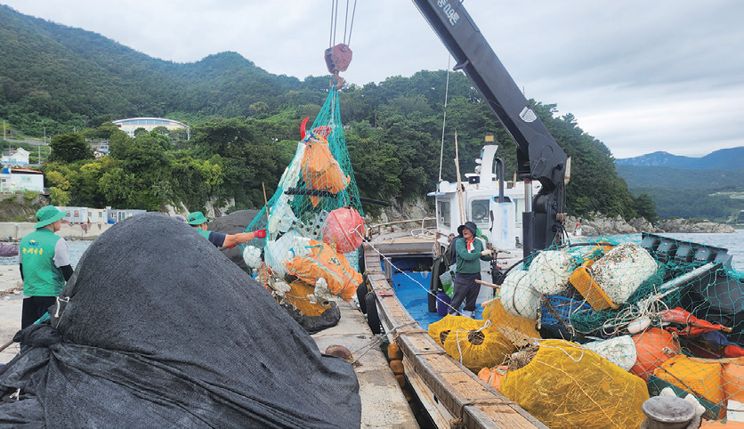 ⦁ 어선과 부두 크레인을 동원해 절벽 해안가 해양쓰레기 운반