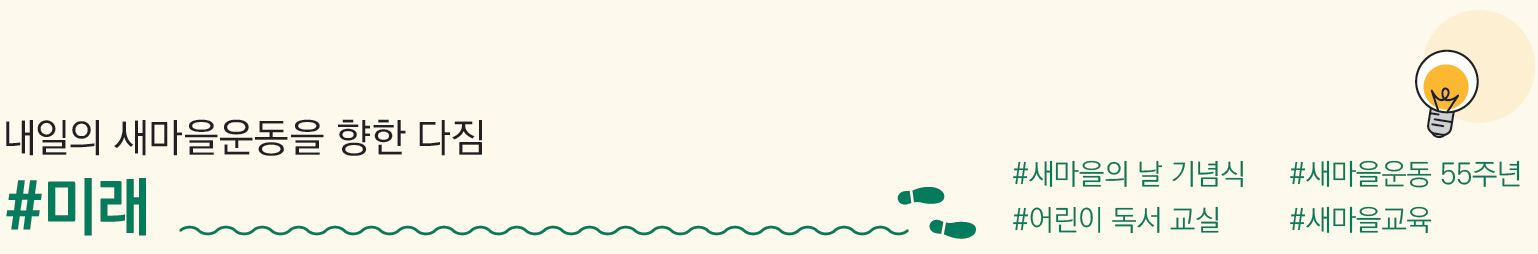 올해는 새마을운동 55주년이라는 뜻깊은 이정표 속에서 새마을 가족이 함께 미래를 향한 새로운 다짐을 모은 한 해였다. 새마을운동 55주년 기념식과 전국새마을지도자대회에서는 변화하는 시대 속에서도 공동체 정신을 어떻게 계승하고 확장할 것인지 깊이 논의됐으며, 각 지역에서도 ‘새마을의 날’과 55주년을 기념하며 다가올 내일을 향한 실천 의지를 다시 한번 굳게 다졌다. 지역에서는 회원 배가와 조직 혁신을 위한 다양한 실천이 이어졌다. 지도자 교육 역시 한층 강화됐다. 현장을 주도하는 지도자들이 새로운 환경에 맞는 역량을 갖출 수 있도록 실무 중심의 연수와 사례 공유가 이뤄졌고, 미래세대를 향한 준비도 놓치지 않았다. 새마을문고는 어린이 독서교실과 인성교육 프로그램을 통해 다음 세대가 자연스럽게 새마을운동을 배우며 성장할 수 있도록 돕고 있다. 한 해를 돌아보면, 이러한 흐름은 모두 미래의 새마을운동을 위한 밑그림이었다. 기존의 가치를 지키되 새로운 방식으로 실천하고, 세대와 지역을 잇는 혁신을 시도하며, 더 넓은 공동체를 향해 나아가려는 마음이 모여 오늘의 새마을 운동을 다시 단단하게 만들었다. 이 축적된 변화들이 내일의 새마을운동을 밝히는 힘이 될 것이다.