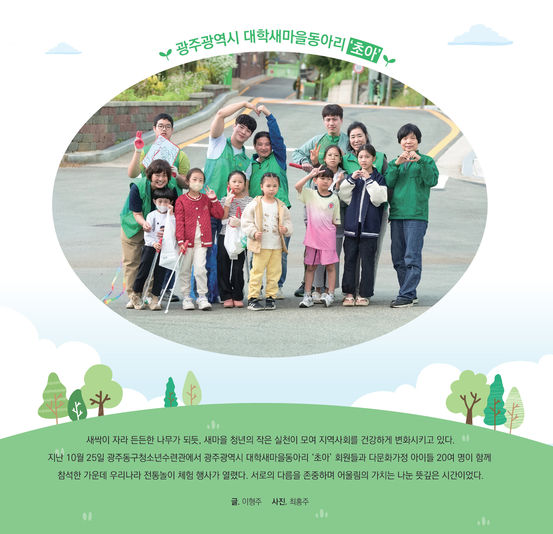 ‘초아’는 새마을정신을 청년 세대의 언어로 재해석해 실천하고 있습니다. 수동적인 봉사에 그치지 않고 미래를 이끌 저희 MZ세대가 직접 주도하는 ‘청년이 앞장서는 새마을운동’을 만들어 가는 것이죠. 오늘 열린 다문화가정 아이들을 위한 한국 전통놀이 체험교실처럼 지역사회의 소외계층을 위한 문화 교류를 활성화하는 한편, 새마을운동의 디지털·온라인 전환을 목표로 SNS를 통한 인식개선 캠페인도 펼치고 있습니다. 이처럼 새마을정신을 새롭게 계승하고 실천하는 것이 우리 동아리만의 특별한 점이라고 생각합니다.