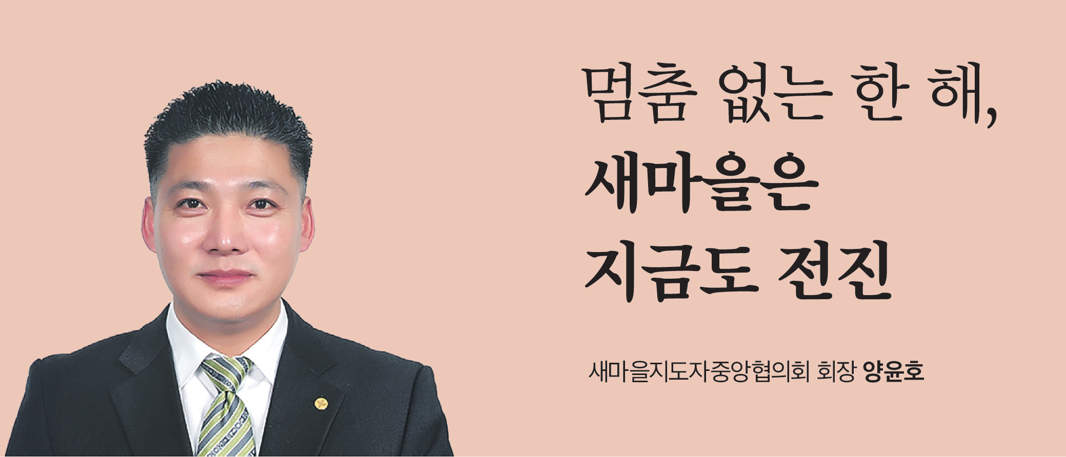붉은 말은 뜨겁고 역동적인 기운을 상징합니다. 우리 새마을지도자들은 이 기운을 이어받아 ‘馬不停蹄(마부정제)’, 즉 ‘말이 달리듯 멈추지 않고 나아간다’는 각오로 새해를 시작하고자 합니다. 그동안 선배 새마을지도자들께서 흘린 땀과 헌신으로 대한민국의 근대화와 지역발전의 기틀을 세운 그 뜻을 이어받아, 우리 모두가 다시금 초심으로 돌아가야 할 때입니다.