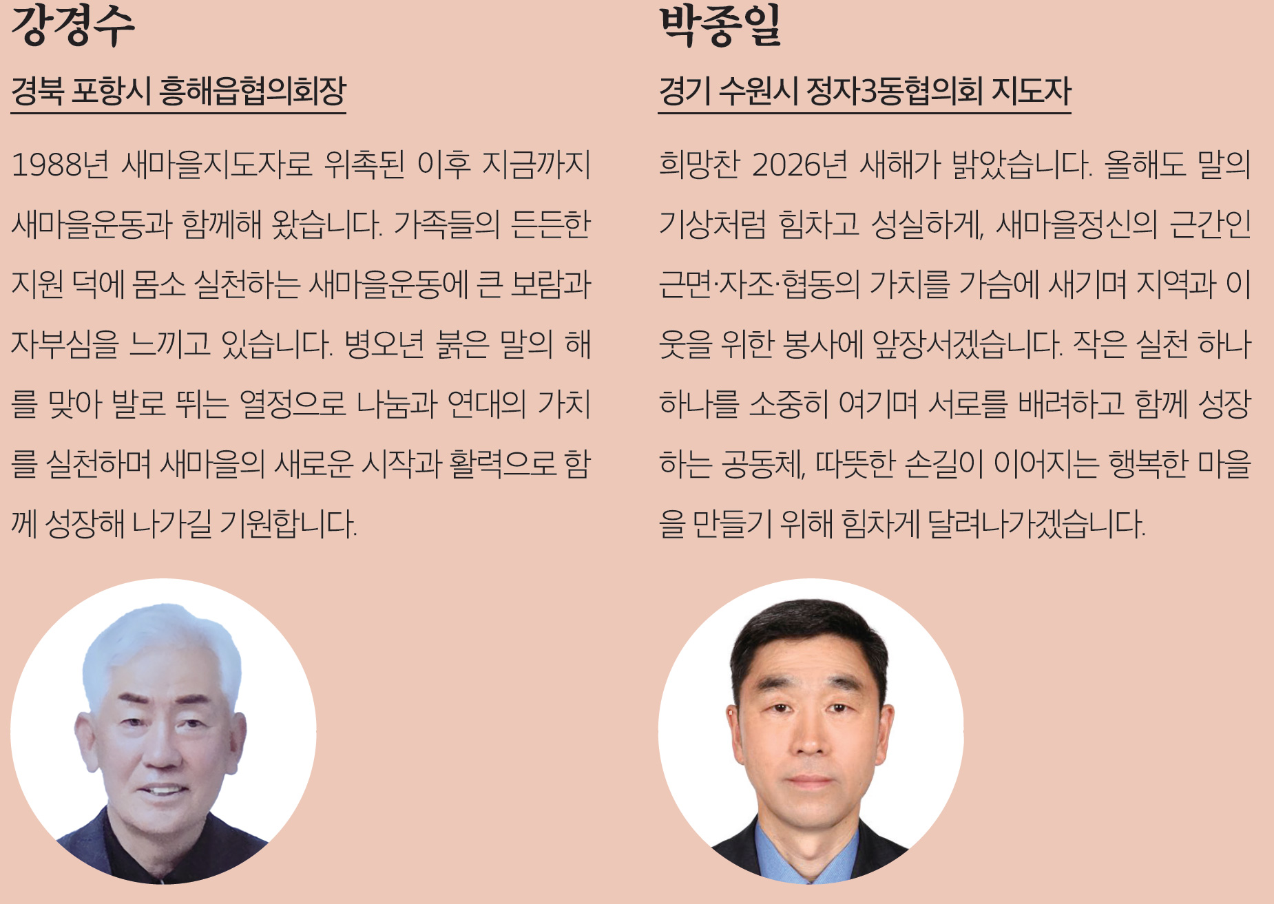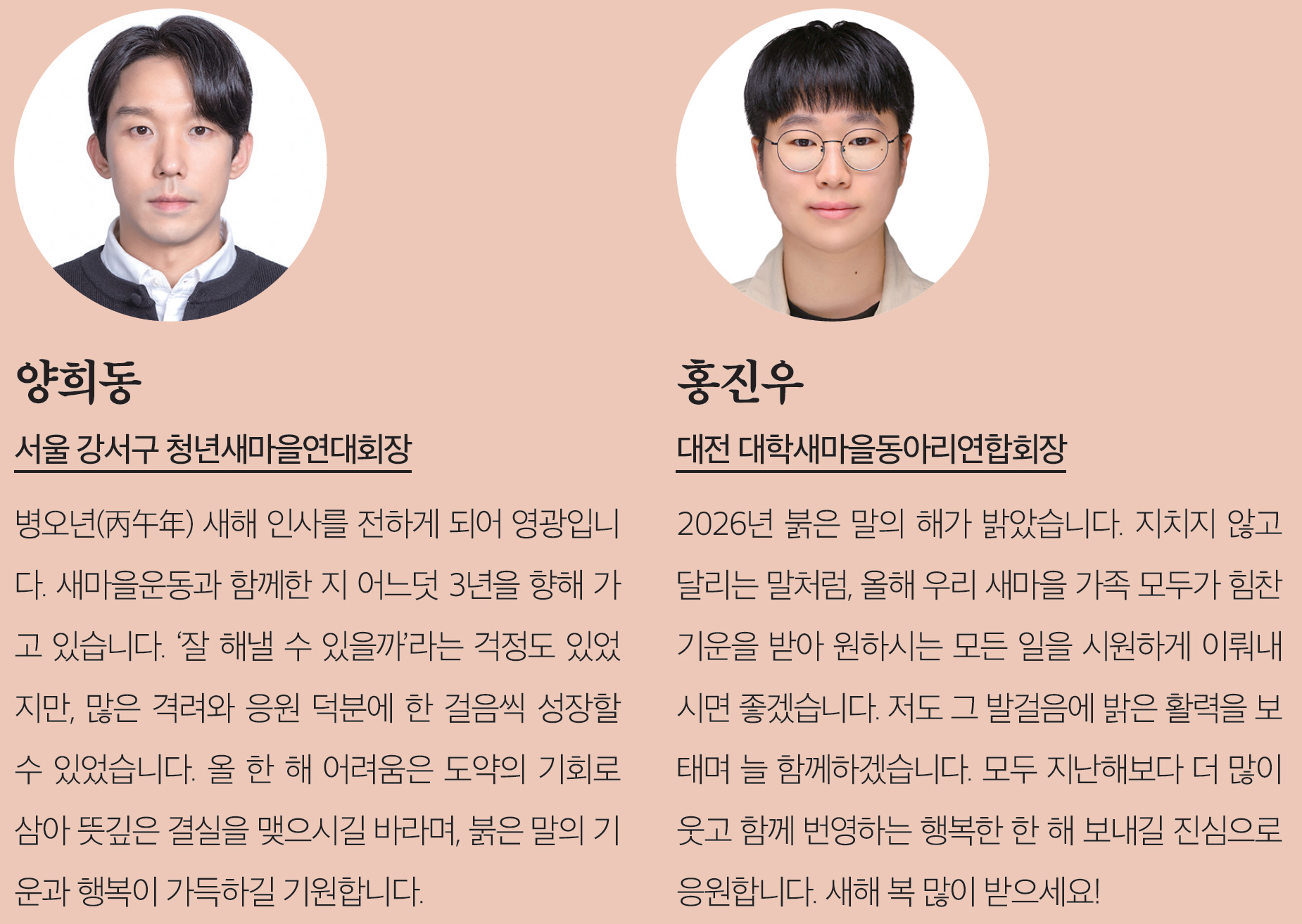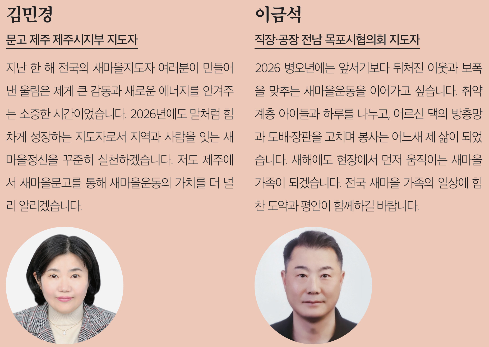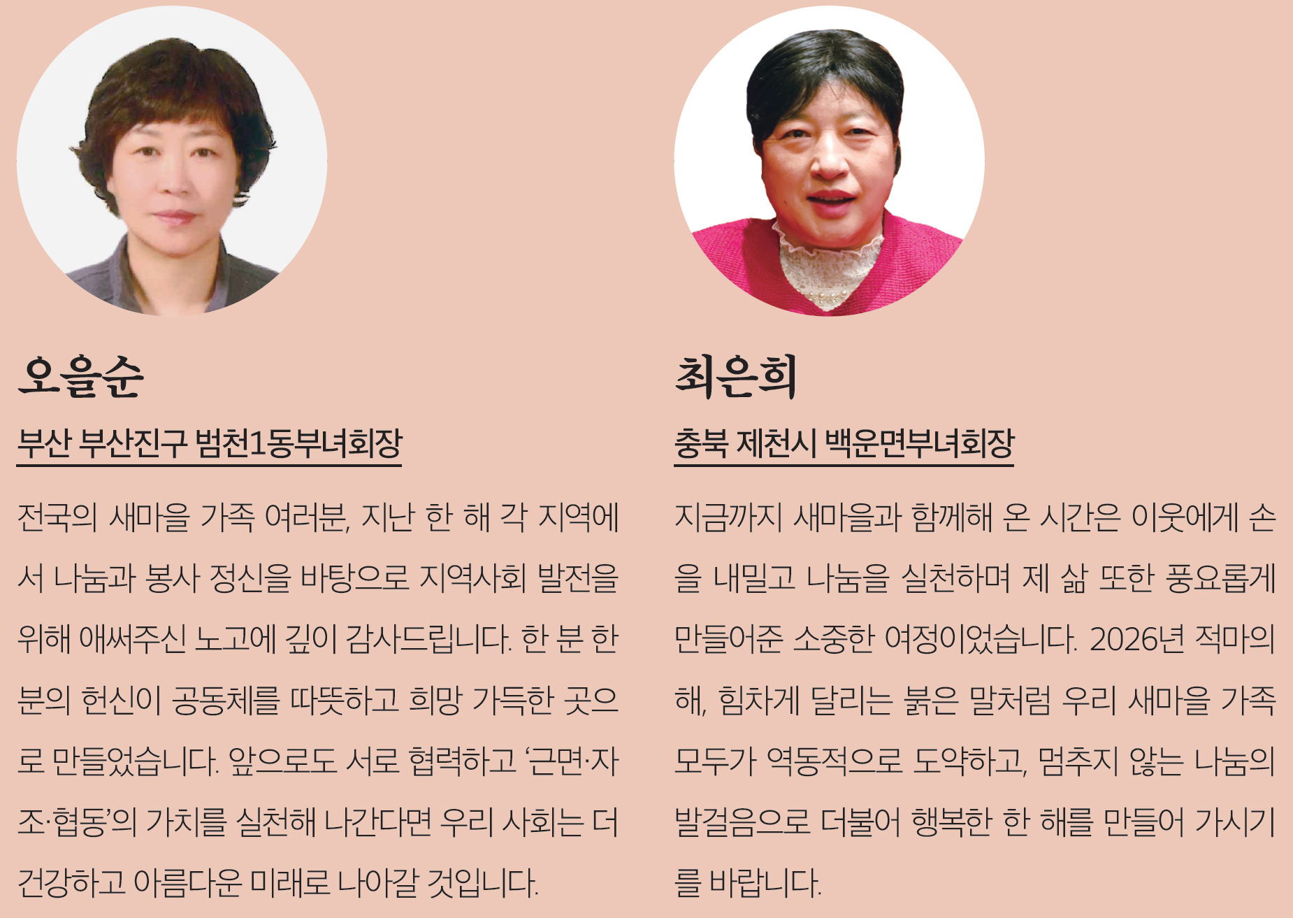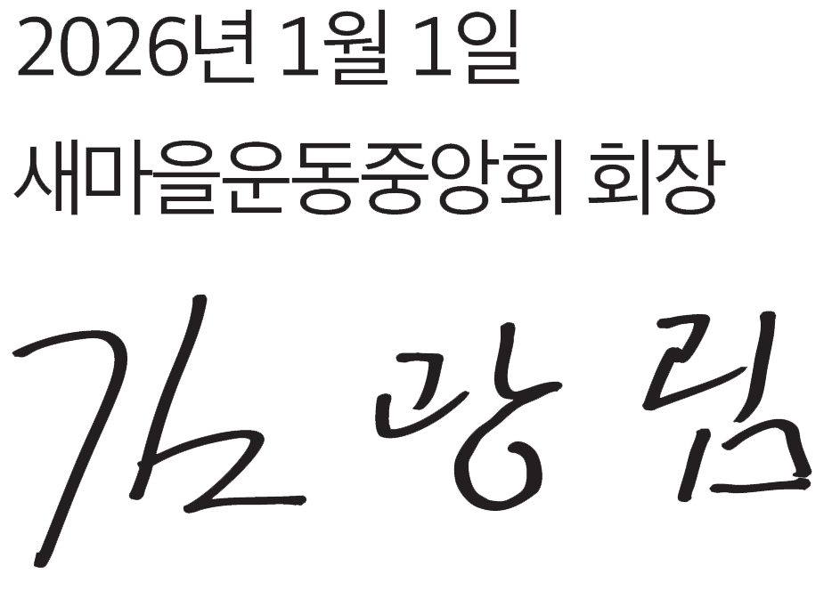 새해에는 붉은 말의 기운처럼 힘차고 담대한 기회가 여러분의 삶 곳곳에 함께하기를 바랍니다. 새마을 가족 한 분 한 분의 가정에 건강과 행복이 늘 함께하고, 서로를 보듬는 따듯한 온기가 온 나라에 널리 퍼져나가는 복된 한 해가 되기를 진심으로 소망합니다.