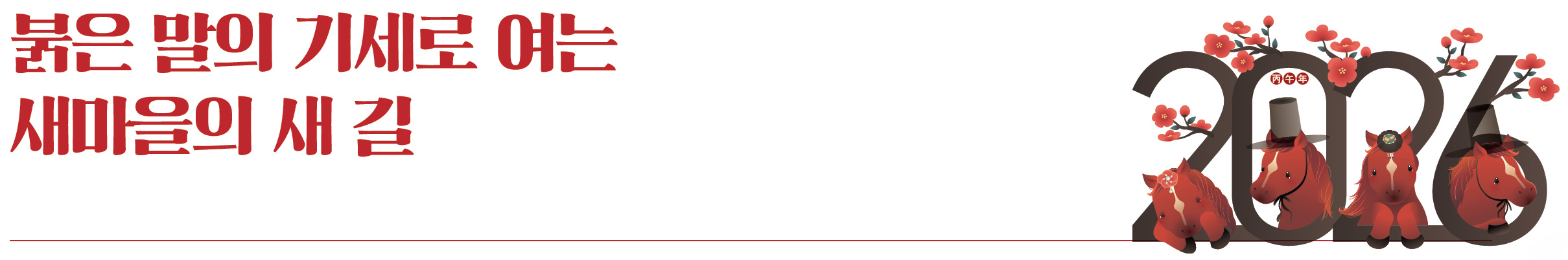 예부터 말(馬)은 거친 대지를 힘차게 내달으며 새로운 길을 개척하는 상징적인 존재로 여겨져 왔습니다. 올해 우리 새마을운동 역시 붉은 말의 역동적인 기운을 받아, 정체된 모든 곳에 활력을 불어넣고, 새롭게 재도약하는 ‘희망과 도전의 해’가 되기를 소망합니다.