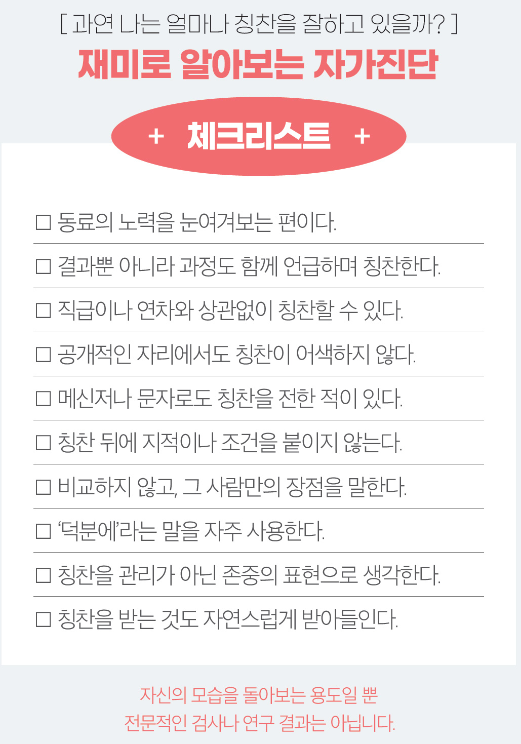 조직의 리더든 구성원이든 자신의 노력이 인정받는 순간을 경험한다면 자신이 조직 안에서 존중받는다는 신호를 읽는다. 칭찬은 조직 자체를 바꾸는 가장 부드러운 장치이기도 하다. 지적은 문제를 바로잡을 수 있지만 칭찬은 바람직한 행동이 반복되도록 만든다. 특히 공개적인 자리에서의 구체적인 칭찬은 조직이 중요하게 여기는 태도와 기준을 자연스럽게 공유하는 역할을 한다.