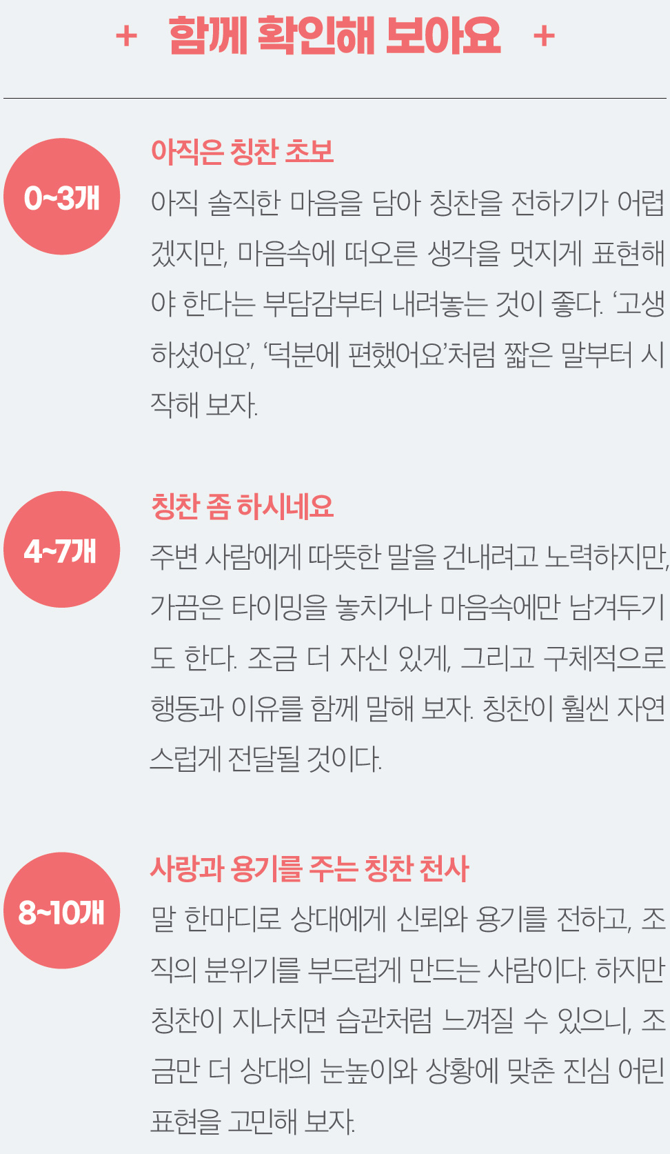 칭찬은 특별한 순간에만 필요한 말이 아니다. 마음속에 남겨두었던 한마디를 제때 건네는 것, 이 작은 실천이 새마을 가족들의 관계를 더 편안하게 만들고 나아가 우리 공동체를 한결 부드럽게 바꿀 것이다. 지금 떠오르는 사람과 칭찬의 한마디가 있다면 망설이지 말고 꺼내보자.