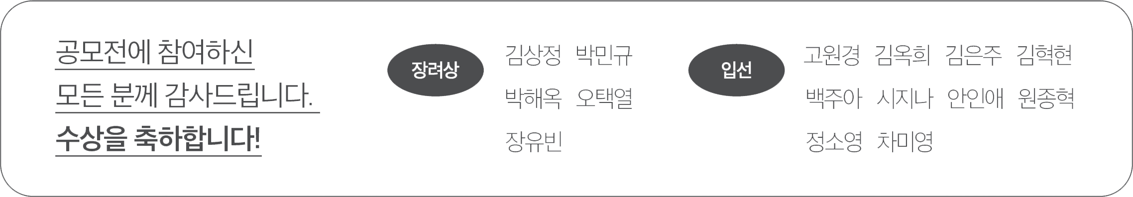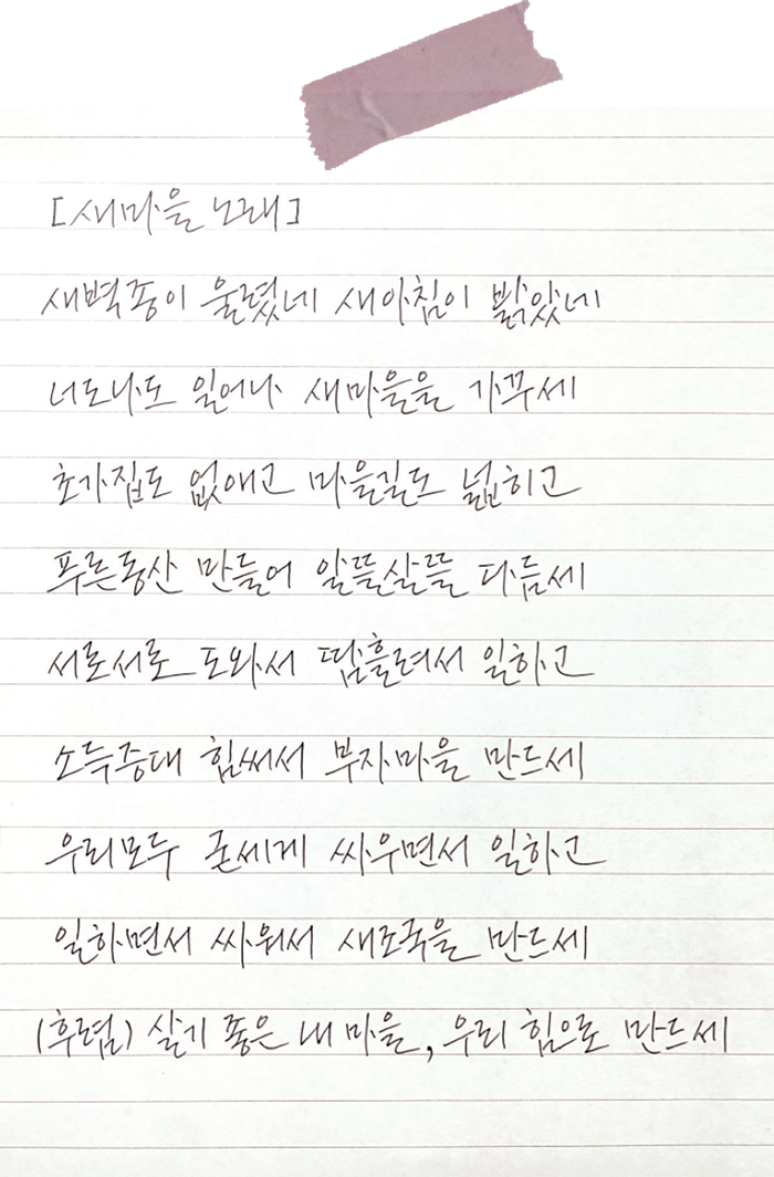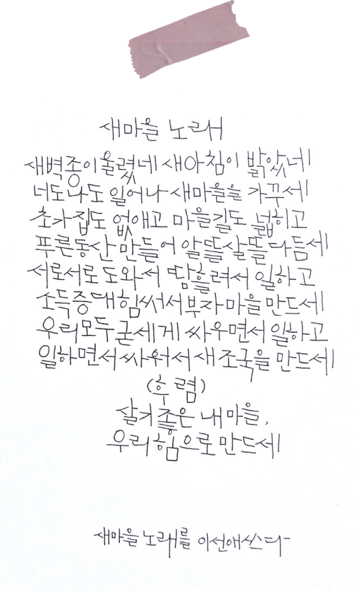 지난해, 새마을운동 55주년을 기념해 새마을노래 가사를 손글씨로 써보는 공모전을 개최했다. 이번 공모전은 세대를 넘어 오랜 시간 불려온 새마을노래의 가사를 손글씨로 옮기는 과정을 통해 가사에 담긴 새마을정신을 다시 되새기고자 마련됐다. 참가자들은 한줄 한줄 각자의 필체로 써 내려가며 가사 속 의미를 저마다의 방식으로 풀어냈다. 그 가운데 선정된 최우수, 우수 수상작들을 소개한다.