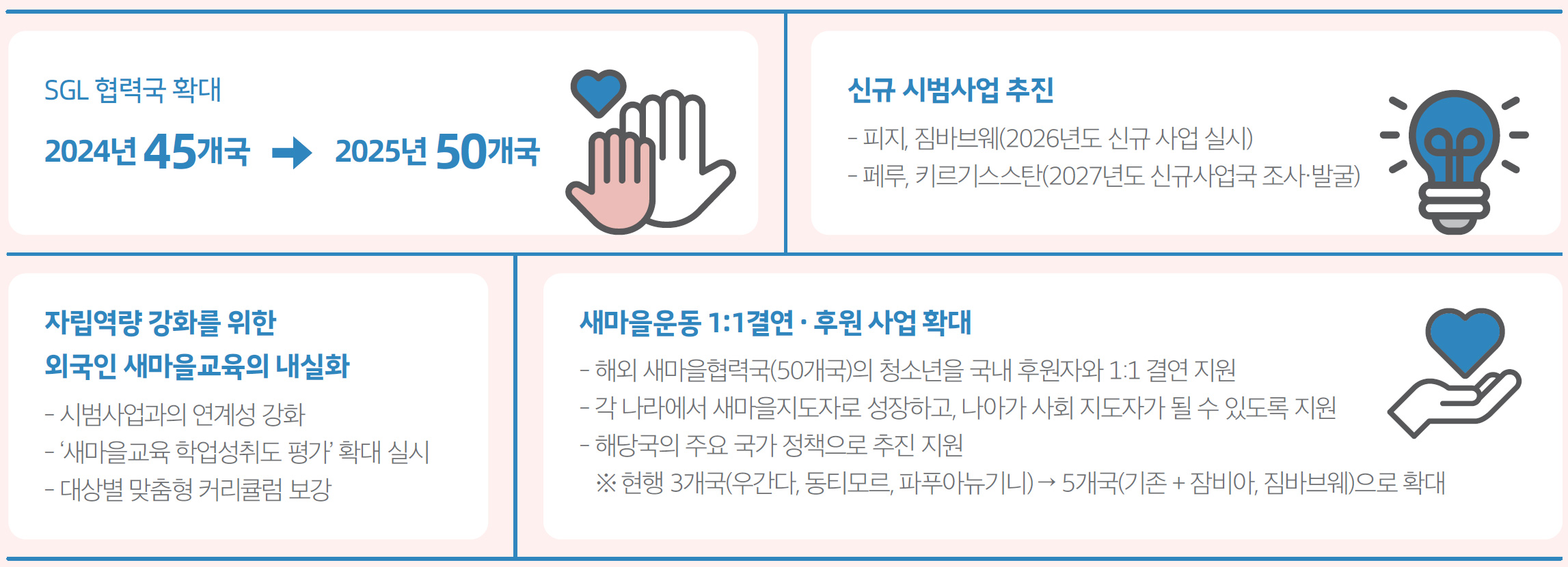 지난 2025년, 새마을운동중앙회는 ‘함께 새마을, 미래로·세계로’라는 비전 아래 지구촌새마을운동을 꾸준히 확산해왔다. 늘어나는 전수 요청에 적극적으로 대응하며 지역별 특성에 맞춘 시범사업을 확대하고 내실을 다졌으며, 외국인 교육 프로그램과 평가 체계를 개선해 교육의 질을 한층 높였다. 또한 고위급 정책협의체인 글로벌 협력국장관회의(GSMM)와 지구촌새마을지도자대회(GSLF)를 성공적으로 개최하고 SGL 회원국을 확대하는 등의 유의미한 성과를 거두었다.